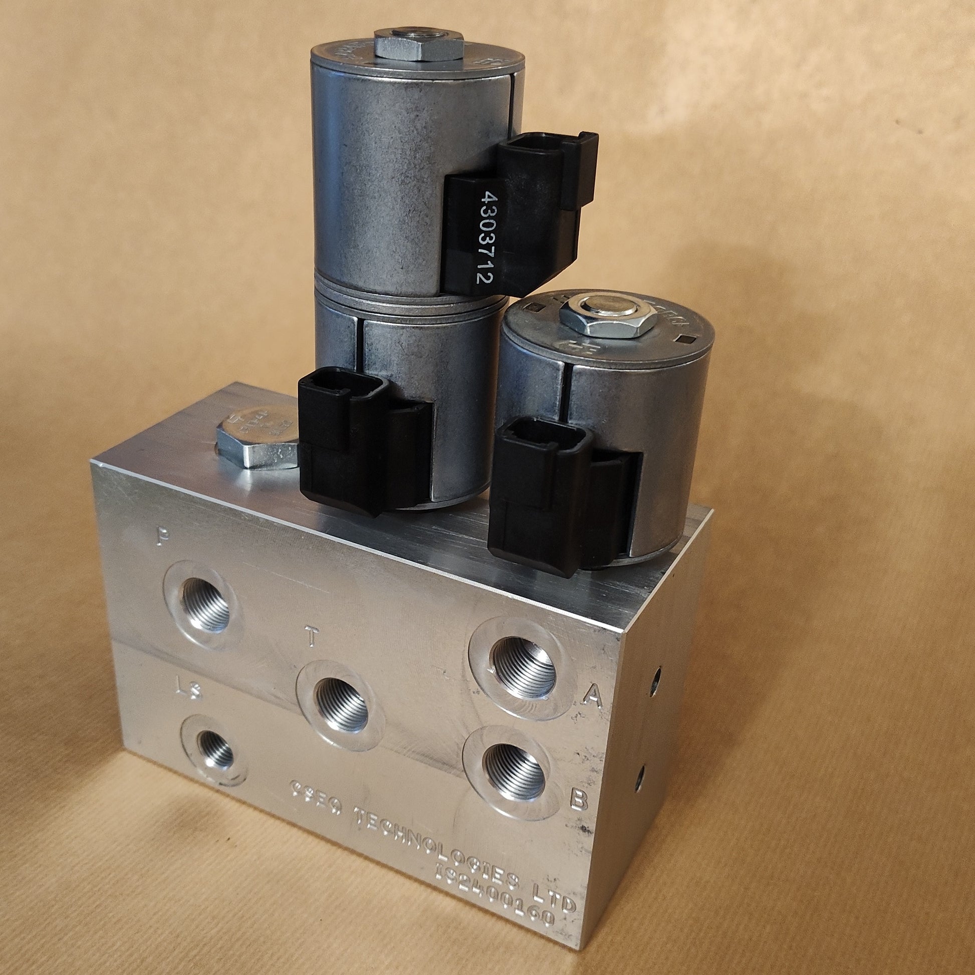The heart of the block is the Hydraforce SP10-57F proportional valve, which offers smooth and responsive control over the steering.